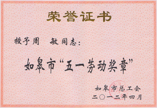 2012年4月26日,如皋市召开庆祝“五一”国际劳动节表彰大会,我集团副总裁、如皋分公司总经理周敏被评为如皋市“五一劳动奖章”获得者。