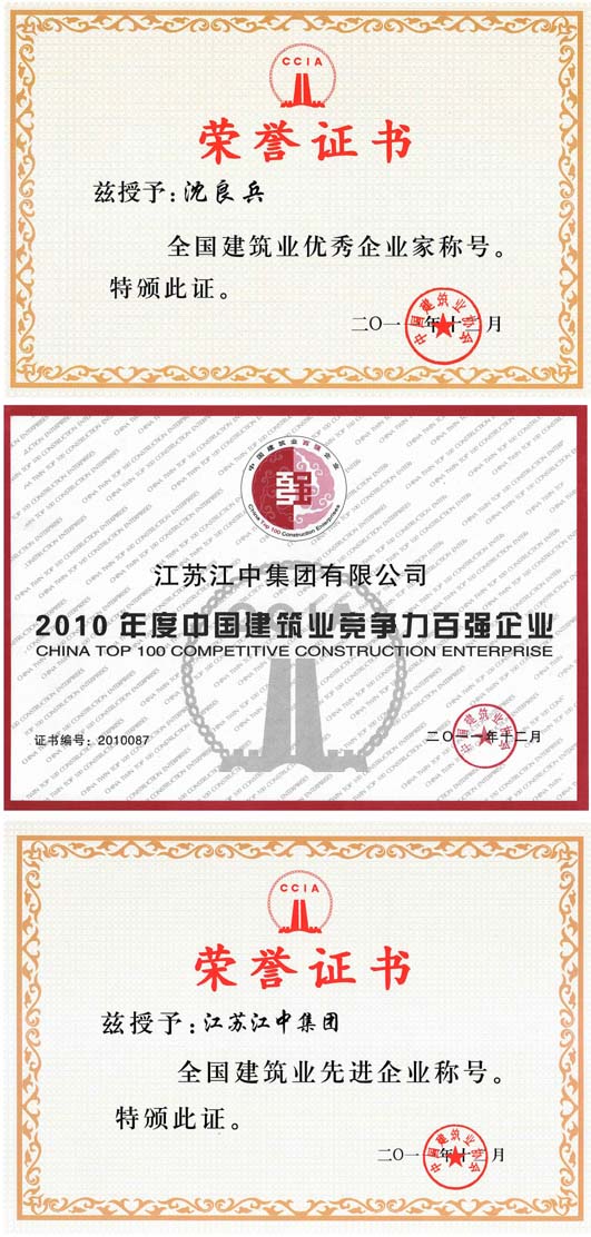2011年12月14日,庆祝中国建筑业协会成立25周年暨2010年度中国建筑业企业双百强发布会在京胜利召开。集团董事局主席被授予全国建筑业优秀企业家称号;集团被授予中国竞争力百强企业、全国建筑业先进企业。