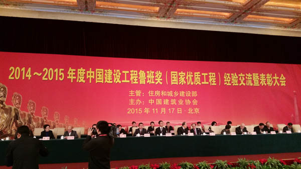 2015年11月17日上午, 2014~2015年度中国建设工程鲁班奖(国家优质工程)表彰大会在北京钓鱼台国宾馆隆重召开。住房城乡建设部、建筑业协会等单位的领导及获奖单位代表近千人参加了会议。我集团总承包施工的海安中洋高尔夫公寓项目荣获此殊荣,集团董事长沈良兵应邀出席颁奖仪式,并上台领奖。