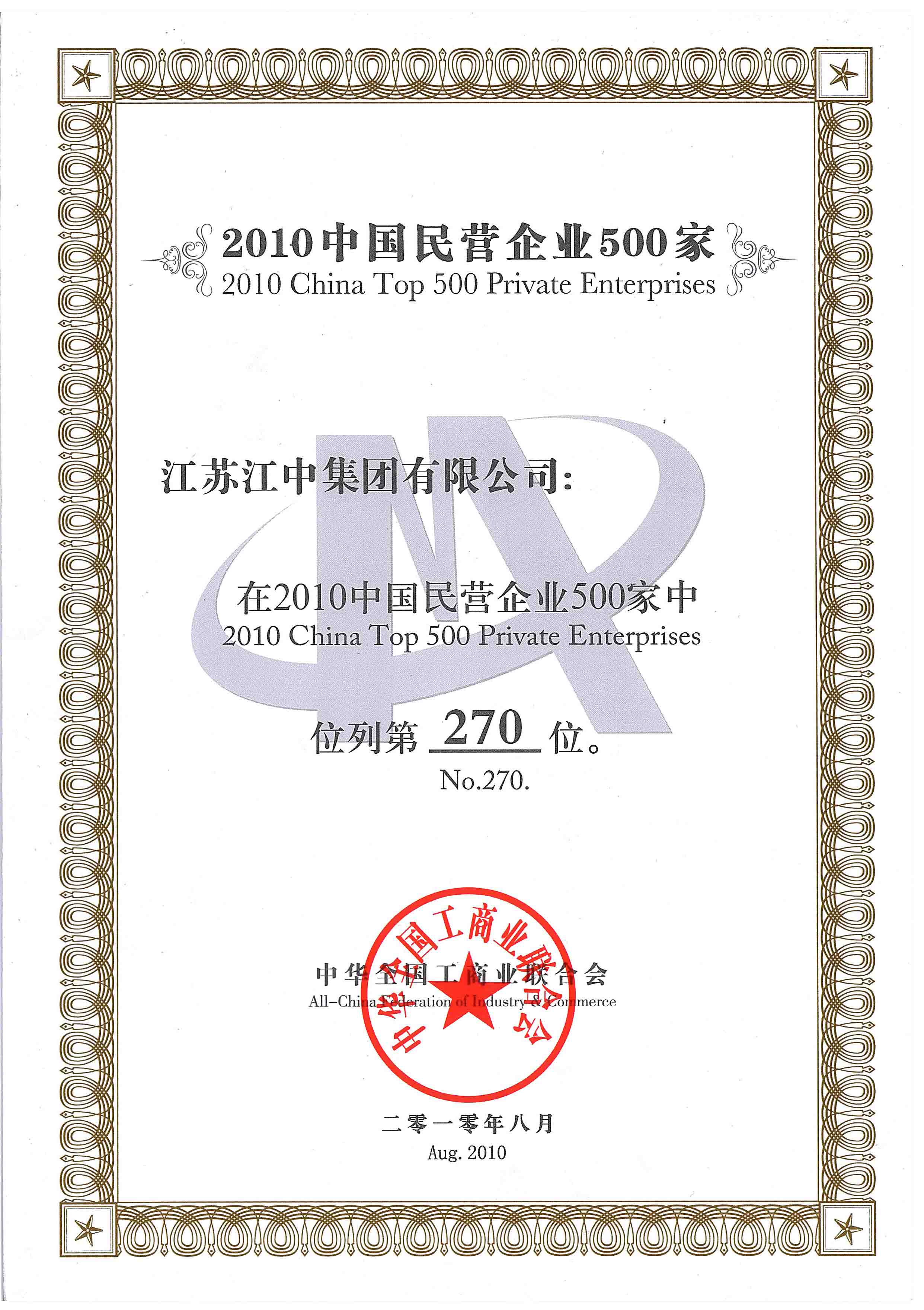 荣获中国民营企业500家