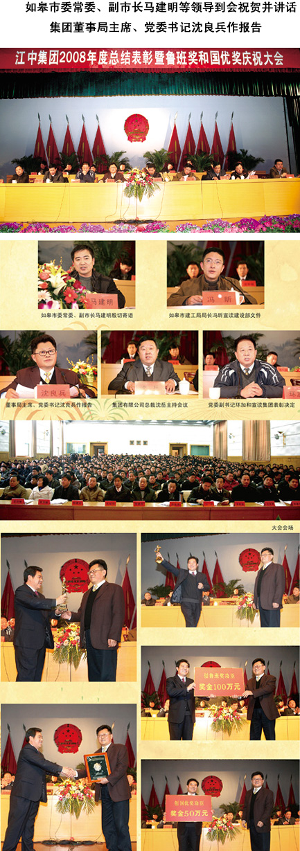 2009年1月30日,农历正月初五,适逢喜迎财神的日子。江中集团2008年度总结表彰暨鲁班奖和国优奖庆祝大会在培训中心大礼堂隆重召开,动员全体党员、干部和职工坚定信心,抢抓机遇,凝心聚力,创新创优,确保集团在新的一年里持续、快速、和谐向前发展。如皋市委常委、副市长马建明,市建工局局长冯昕,集团领导班子成员、全体党员干部、总公司全体人员、各下属公司全体班组长以上管理人员和职工代表1000多人出席会议。