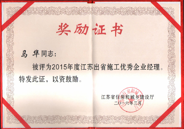 近日,江苏省住房和城乡建设厅对2015年度江苏省施工先进企业和先进个人予以通报表彰,集团东北公司荣膺2015年度出省建筑施工先进企业,东北区总经理马华被授予出省建筑施工优秀企业经理、东北公司副经理高子兵被授予出省建筑施工优秀项目负责人称号。